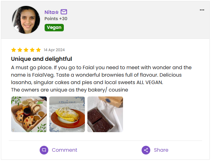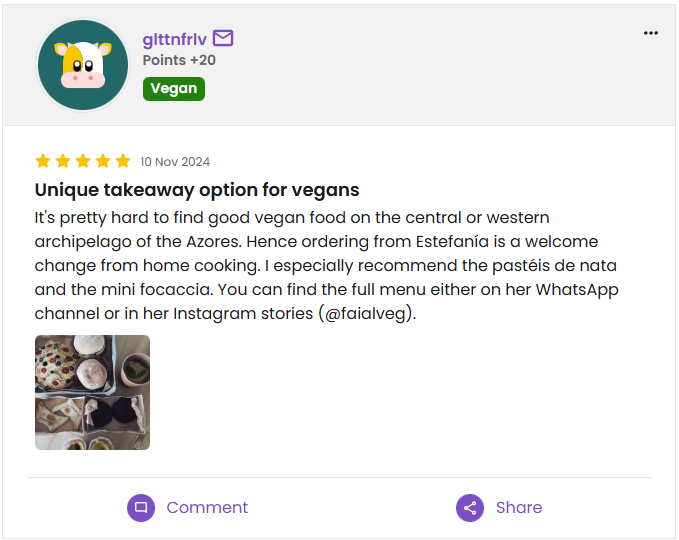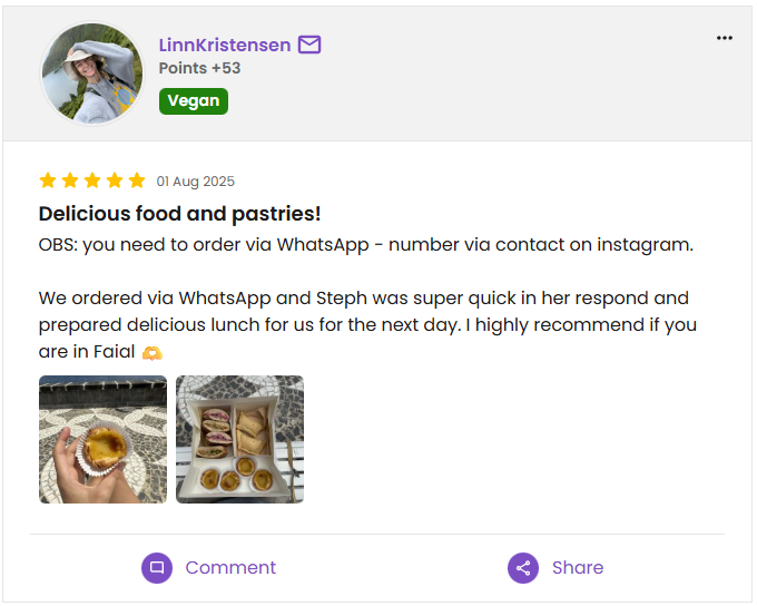 Avaliações dos nossos clientes em plataformas como Instagram, HappyCow e WhatsApp